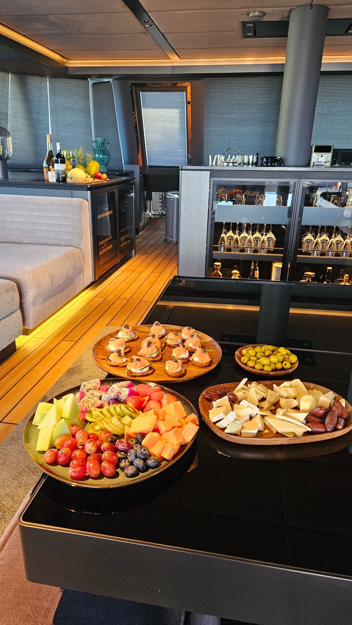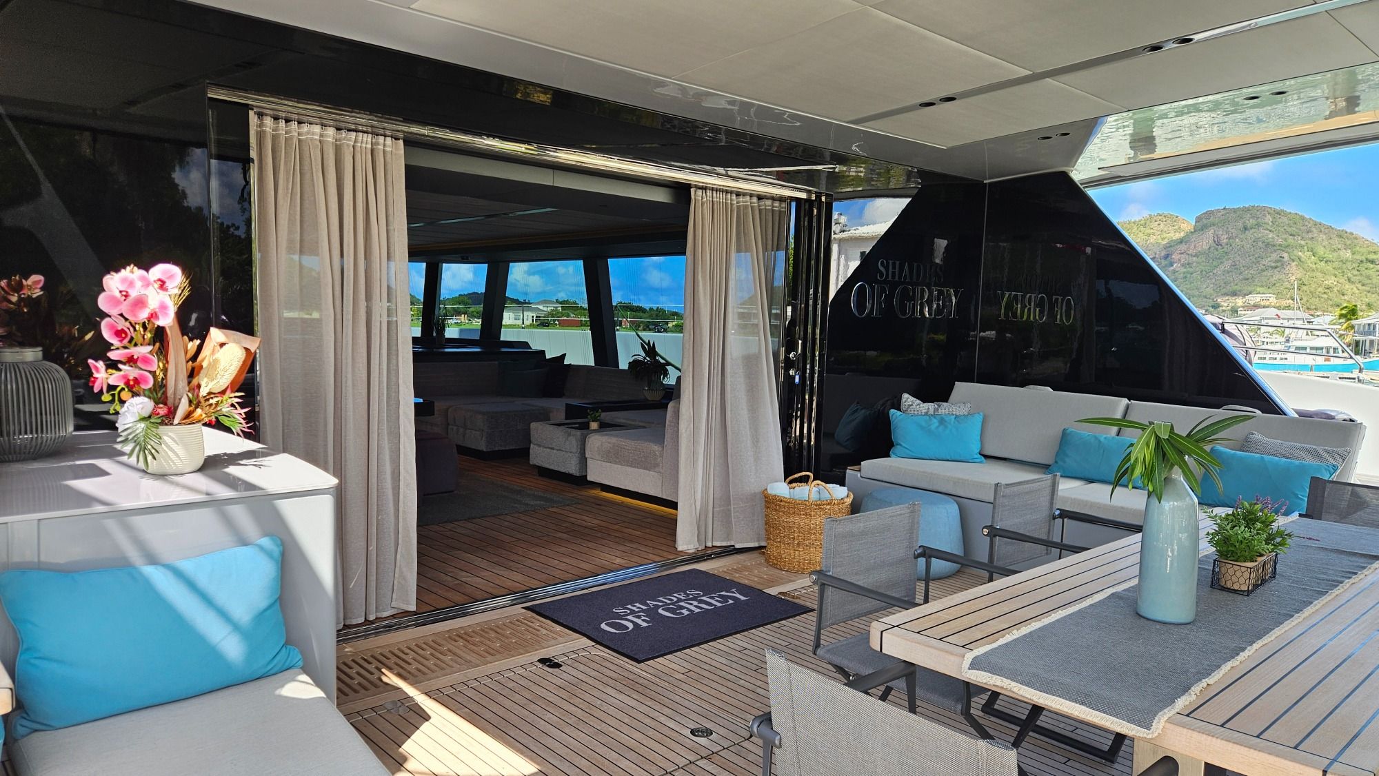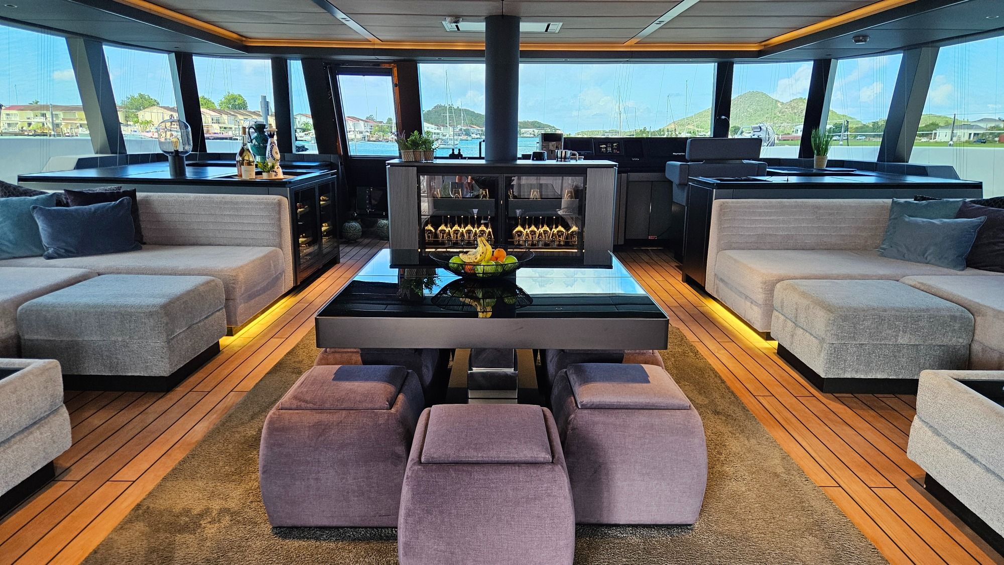 - Geräumiges offenes Salondesign mit riesigen Loungesofas und edlem Teakholzboden