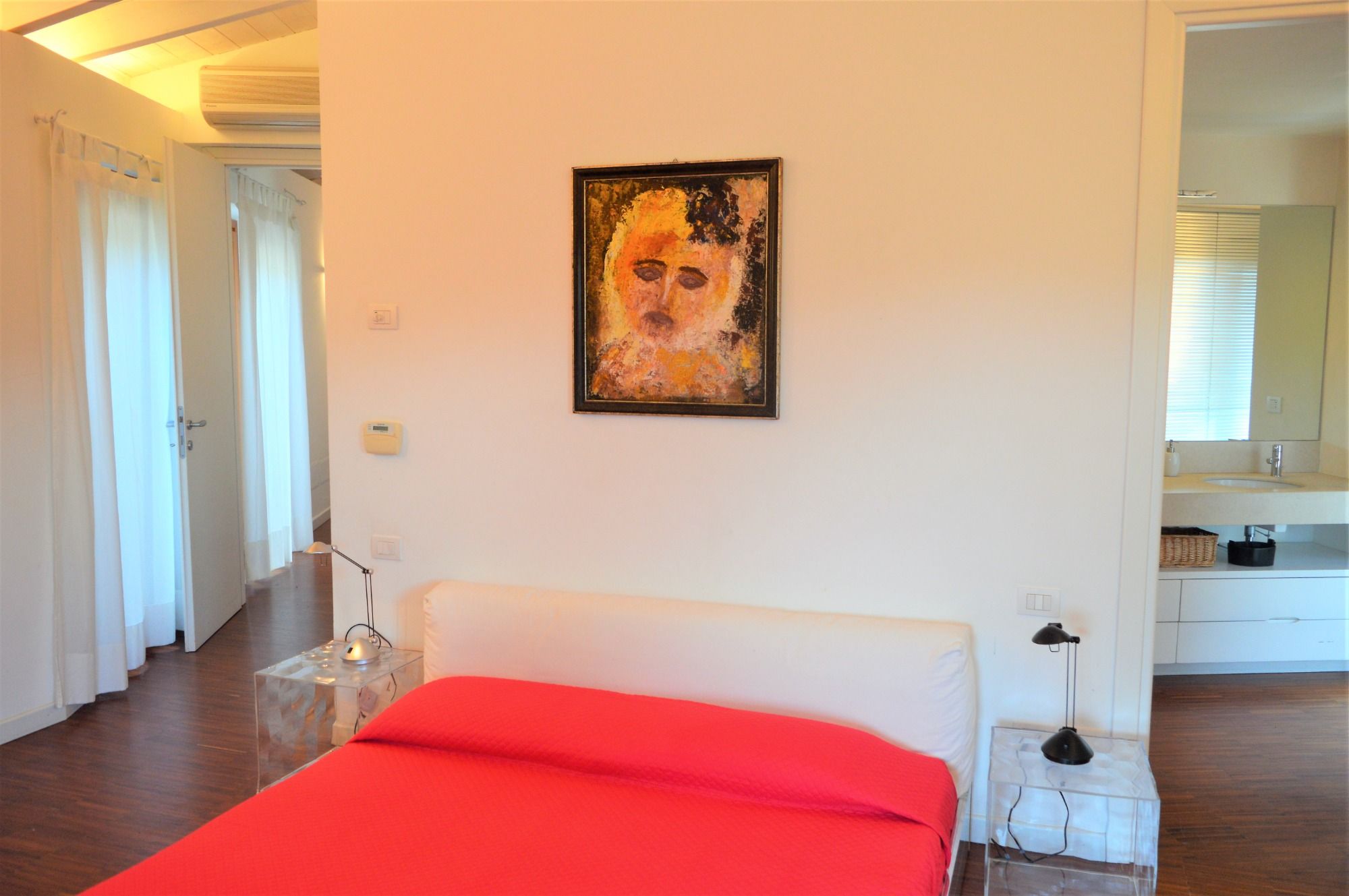 Das Wohnzimmer führt zum ersten Schlafbereich mit zwei geräumigen Doppelschlafzimmern, die jeweils über ein Badezimmer innerhalb der Schlafzimmer mit WC, Dusche und Bidet verfügen. Alle Schlafzimmer blicken auch auf den Garten des Hauses in die Natur.